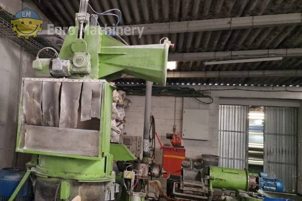 EREMA RGA 100 Recyclinganlage für PE-Materialien mit einer 100 mm Schnecke und einer Leistung von bis zu 120 kg/h. Inklusive Agglomerator-Extruder-Kombination, Heißdüsen-Granuliersystem und Zubehör. Marke & Modell: EREMA RGA 100 Material, das verarbeitet werden kann: PE Schneckendurchmesser: 100 mm 24 L/D Leistung: Bis zu 120 kg/h, abhängig von der Art des Materials und der Zuführungsrate. Keine Entgasung Extruder Trichter Typ: Agglomerator/Schneidverdichter – Extruder-Kombination Pelletiersystem: Heißgranulierung auf Matrize – Wasserkreislaufsystem Anbaugeräte und Zubehör:- Wasserbad